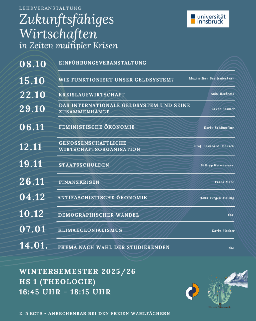 Die Veranstaltung ist offen für Studierende und alle Interessierten und wird von der Gesellschaft für Plurale Ökonomik Tirol organisiert.